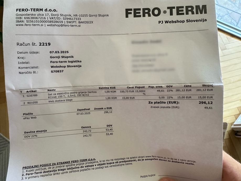 Prodajam omenjeno električno talno gretje, ki je bilo kupljeno 5.3.2025 preko spletna (Fero-Term), vendar se je pred polaganjem ugotovilo, da je kupljena kvadratura prevelika.