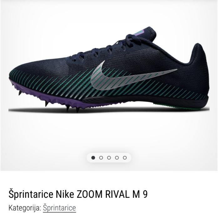 Prodam Šprintarice Nike ZOOM RIVAL M 9, zelo malo rabljene in odlično ohranjene. Zraven dodam rezervne špice. Velikost 46.