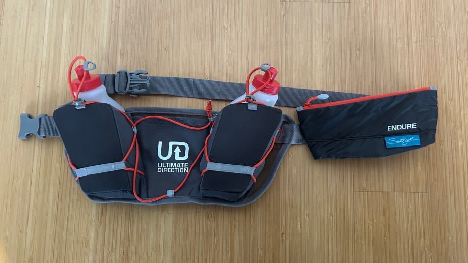 Prodam praktično nov in nerabljen tekaški pas Ultimate Direction z dvema mini bidonkma (2x 250 ml).