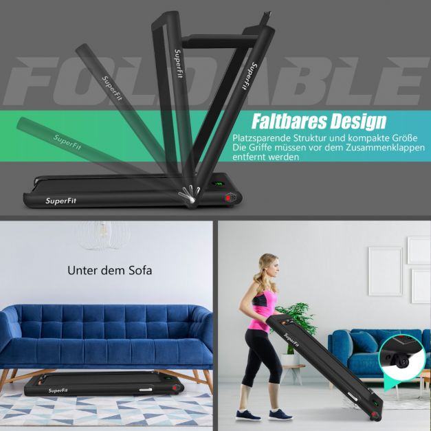 Prenosna zasnova in enostavno shranjevanje: Tekalna steza ima kompaktno zasnovo in je zložljiva za enostavno shranjevanje. Po zlaganju meri tekalna steza le 133,5 x 68,5 x 12,5 cm (D x Š x V), kar omogoča enostavno shranjevanje pod posteljo ali kavč in zavzame malo prostora. Poleg tega vgrajena premična kolesa zagotavljajo enostaven in udoben transport.
