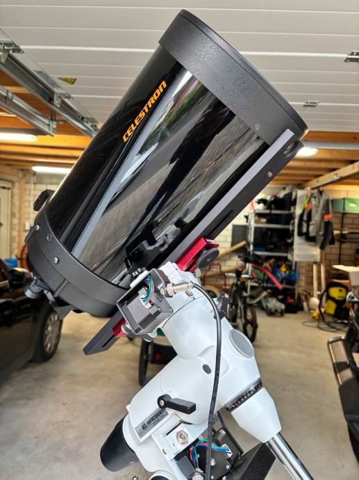 Teleskop Celestron C8 iz zapuščine v odličnem stanju, v paru z Bresser Exos 2, prirejen s sistemom Onstep Goto za enostavno sledenje in aplikacijo Goto with OnStep. Teleskop je opremljen z montažo Losmandy z adapterjem za rebrni rep, zato se lahko uporablja s katero koli montažo za teleskop. Okularji Baader Planetarium 8-24 mm Mark 4 zoom in Morpheus 4,5 mm ter okular TS Optics 32 mm so v popolnem, skoraj novem stanju. Dodatna oprema: