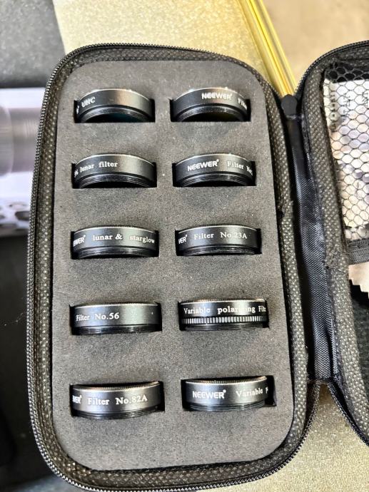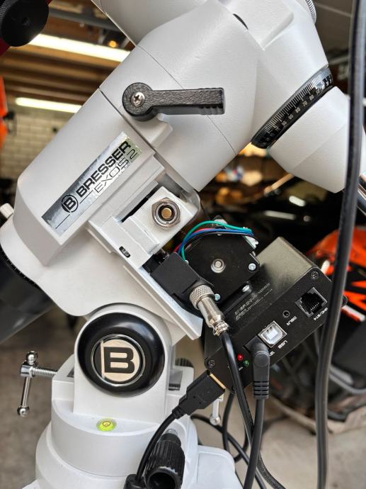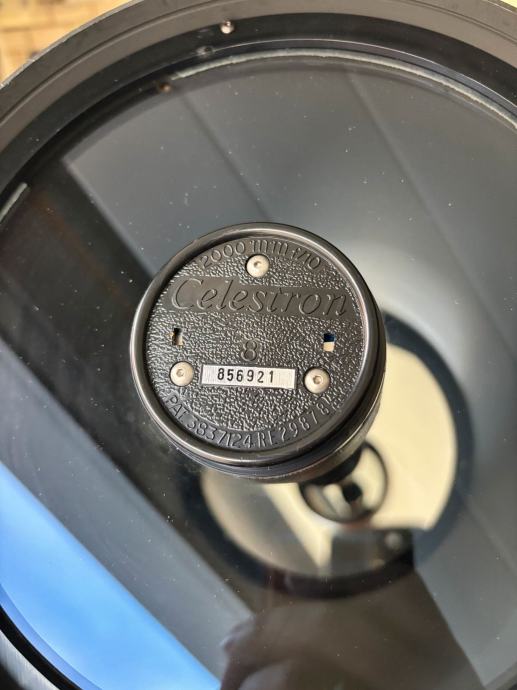 Teleskop Celestron C8 iz zapuščine v odličnem stanju, v paru z Bresser Exos 2, prirejen s sistemom Onstep Goto za enostavno sledenje in aplikacijo Goto with OnStep. Teleskop je opremljen z montažo Losmandy z adapterjem za rebrni rep, zato se lahko uporablja s katero koli montažo za teleskop. Okularji Baader Planetarium 8-24 mm Mark 4 zoom in Morpheus 4,5 mm ter okular TS Optics 32 mm so v popolnem, skoraj novem stanju. Dodatna oprema: