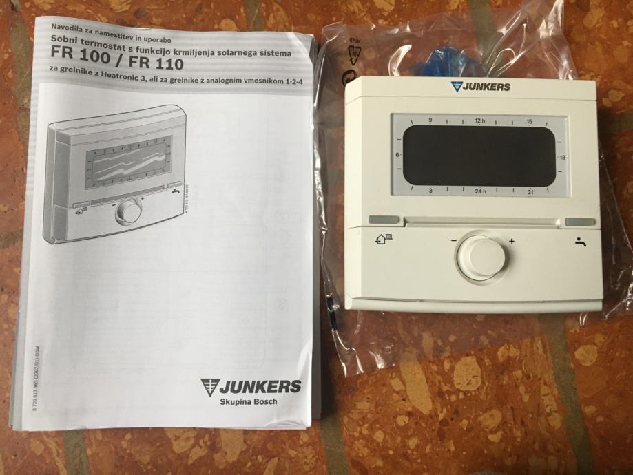 Rabljen FR100 Programski termostat Junkers (regulator sobne temperature). Delujoč, prodajamo zaradi menjave peči. Več informacij na telefonski številki 0 tri 1 68 šest 6 dva 2