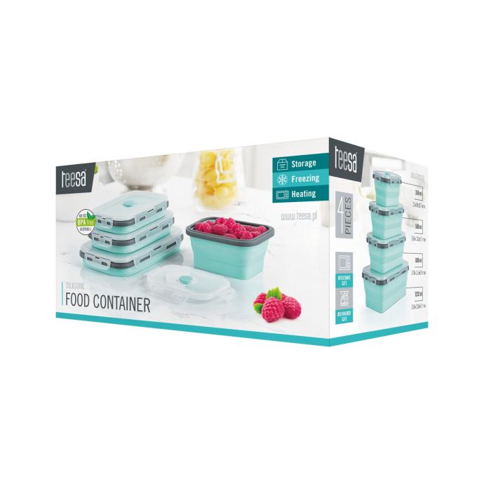 Štiri Teesa posode za hrano so praktičen set, ki bo zagotovo uporaben v vsakem domu. Zaradi svoje funkcionalnosti so odlični za prenašanje malice v službo ali šolo, nenadomestljivi pa bodo med kampiranjem ali izleti na vrt. Zahvaljujoč njihovim oblikam in različnim prostorninam od 350 ml do 1200 ml, lahko vanje uspešno shranite porcije kosila, sendviče, solate, zelenjavo in druge izdelke. Varnost shranjevanja hrane zagotavlja tesen, popolnoma prilegajoč se plastični pokrov, pritrjen na vsako posodo.