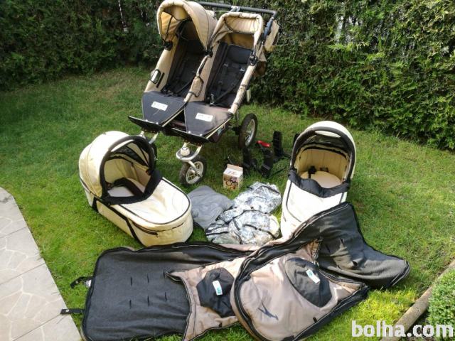 Lepo ohranjen vozicek. Nova napihljiva kolesa. Rocna zavora (primeren za klance) in razgibane terene. Vozicek je primeren za dvojcke ali dva otroka z malo razliko. Vozicek je se lahko uporablja od rojstva otroka dalje. Razen sportnega dela v kompletu dobite tudi globoke kosare, prevleke za dez, proti komarjem, drzalo za pijaco, adapter za maxi cosi lupinice, ppdloge proti potenju in zimske vrece za dojencka.