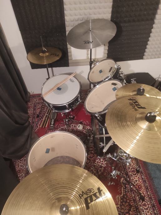 Zraven dam še originalne činele: ABX 18" crash/ride, 13" hi-hat in stojalo za Hi-hat, stojalo za crash, teleskopsko dvojno stojalo za crash in splash, stojalo za ride in pedal za bas boben.