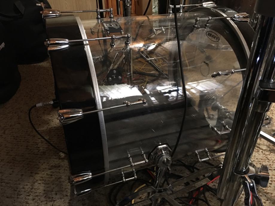 Chrome hardware, Gauger tom mounts, 2.3mm power hoops. Zelo malo rabljeni, izgledajo super sploh za koncerte in imajo odličen zvok. Remo Pinstripe opne na tomih, Evans Emad na bas bobnu.