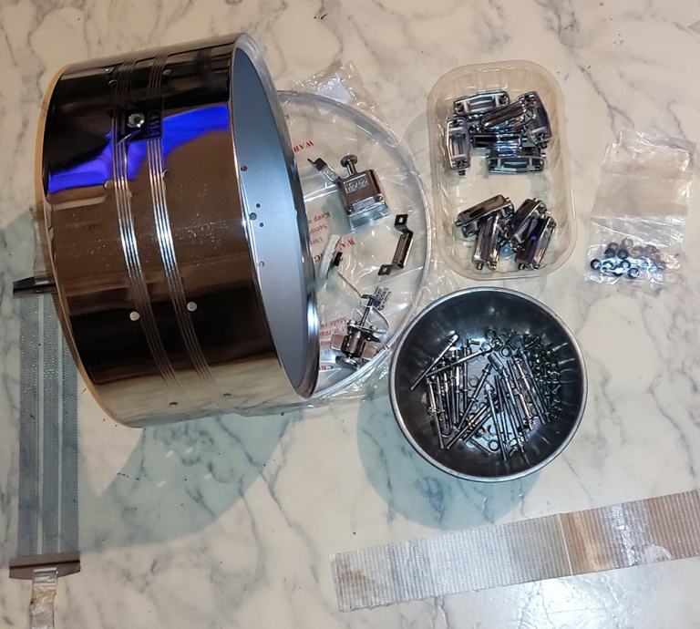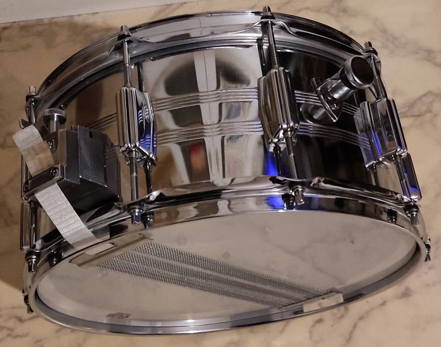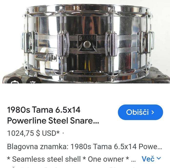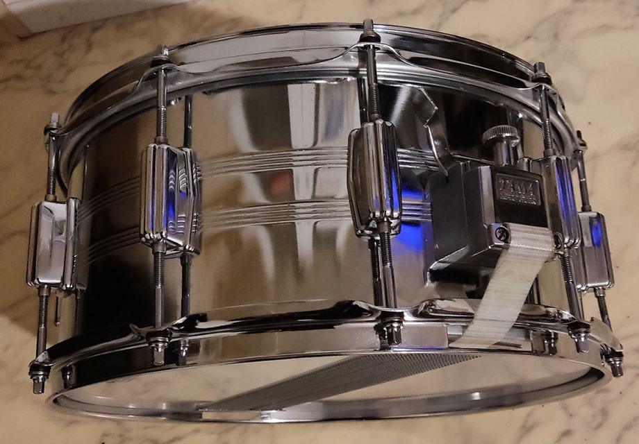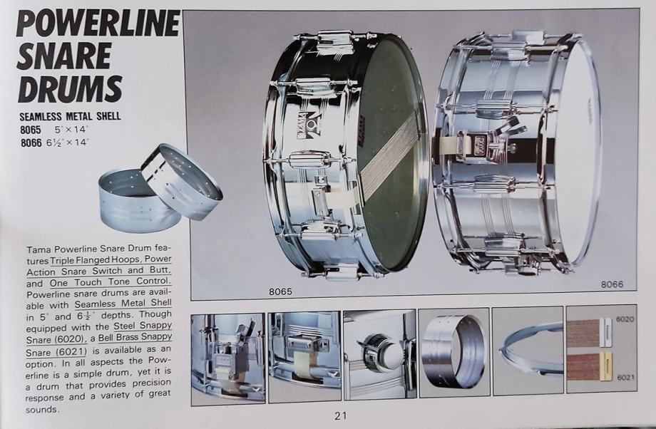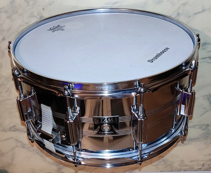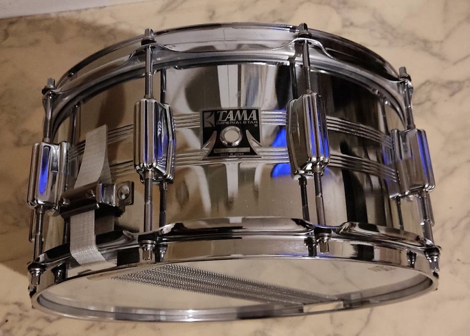 Tama Imperialstar Powerline 14x6,5, Japan, letnik 82, brezšivna fusta, bolj preprosta verzija pseudo paralelnega mehanizma za mrežico Mastercrafta, sploh pa paralelnega mehanizma King Beata.