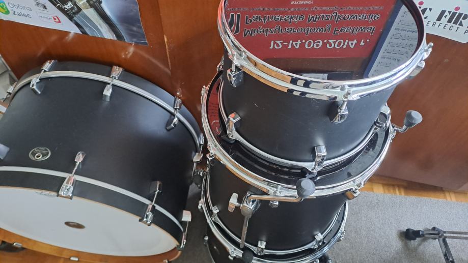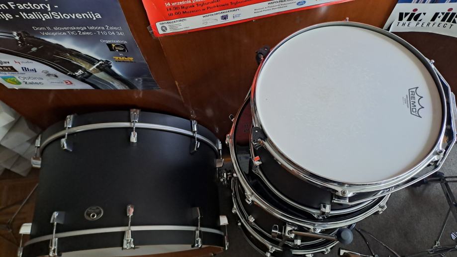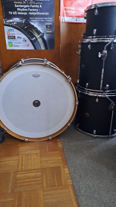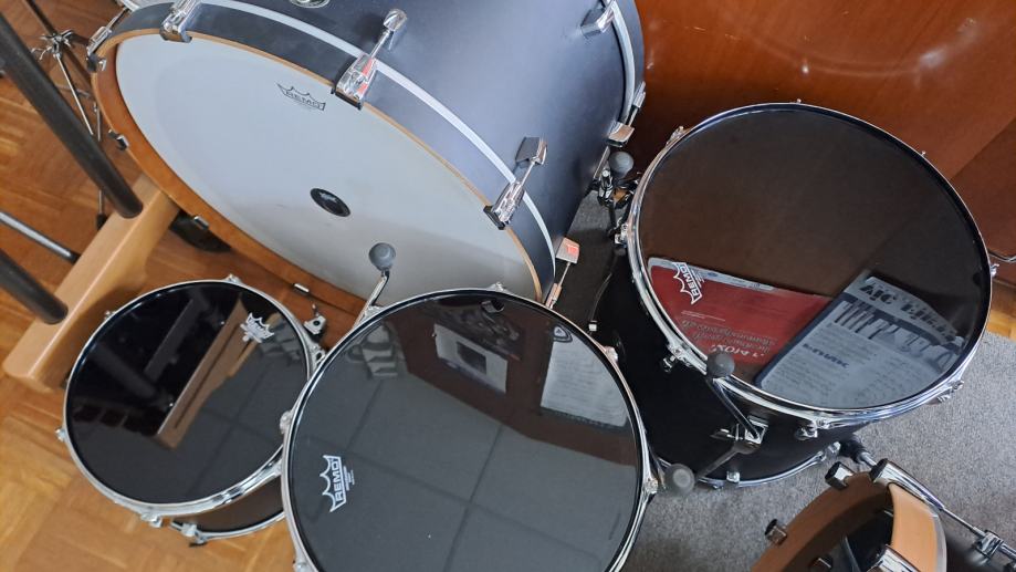 Odlično ohranjeni, popolnoma nove Remo ebony in Remo Ambassador opne, na bas bobnu Remo powerstroke 4!