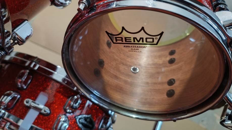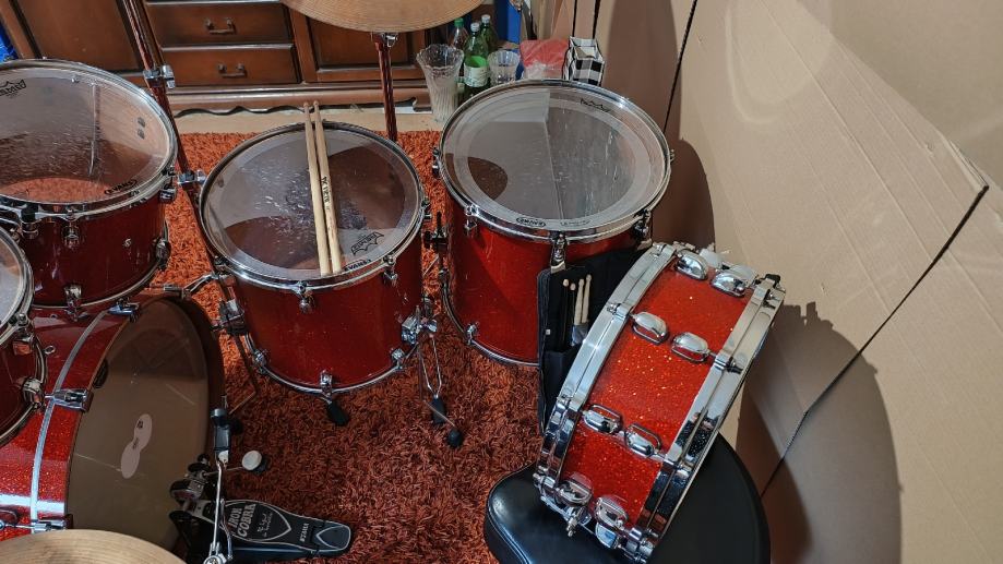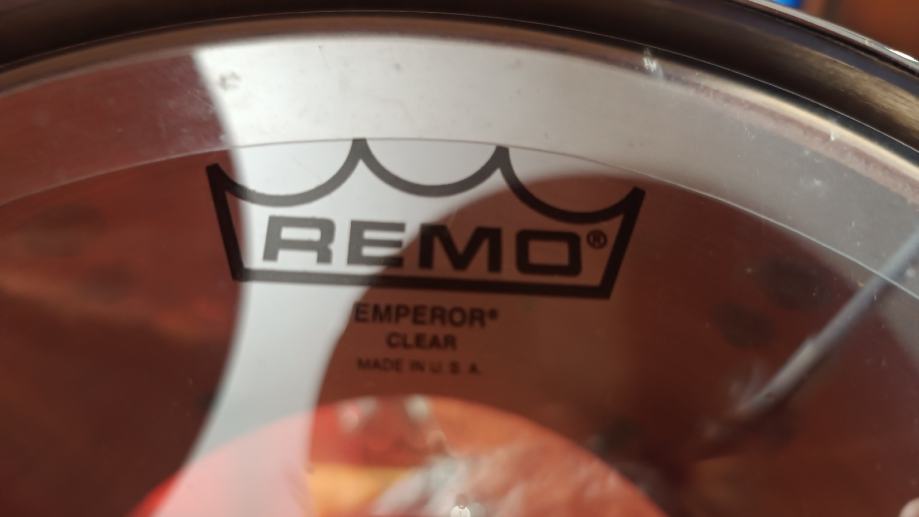 Bubnjevi su jako lijepo očuvani, plastike: snare Remo emperor couted,dole 300 hazy, tomovi i florovi Remo emperor clear, dole Remo ambasador clear.