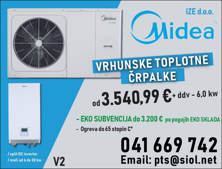 MIDEA - absolutno vrhunske toplotne črpalke split DC inverter moči 6,8,12,14,16.. MIDEA zagotavlja absolutno najvišjo kvaliteto njihovih produktov, vgrajene samo najboljše komponente: twin rotacijski kompresor,elektronska obtočna črpalka, ALFA LAVAL toplotni izmenjevalec, itd. ENERGETSKI RAZRED A +++/A ++ Hladivo R 32, ogreva do 65 stopinj C.