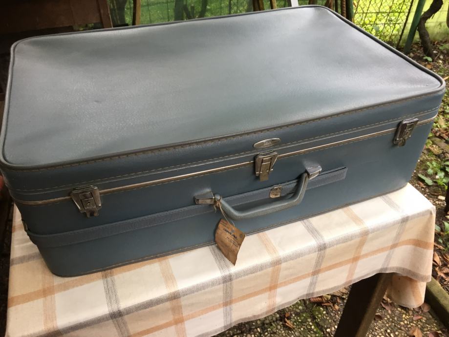 Prodaja se druzinski Retro plavi Sears Featherlite potovalni kovcek dimenzije 75x50x25cm. Kljucka ni. Uporabljen enkrat na relaciji Miami (ZDA) - Ljubljana z letalsko druzbo Pan Am.