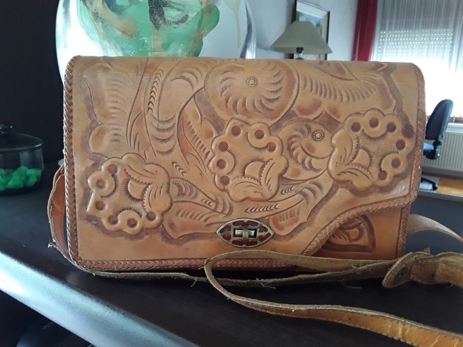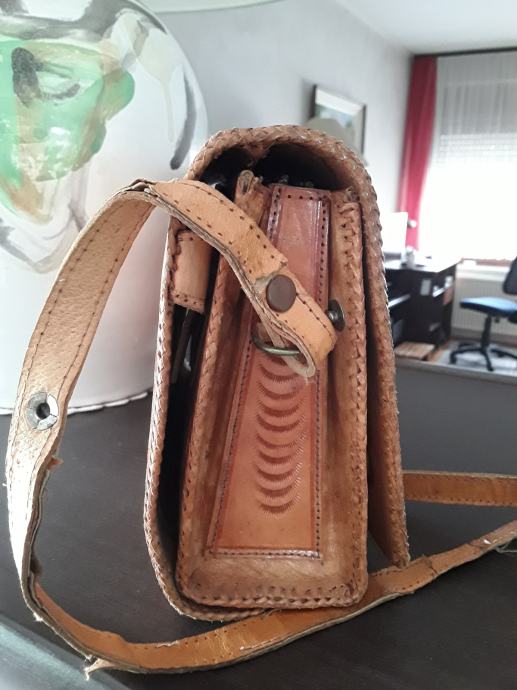 Usnjena unikatna torbica, ročno delo, stara več kot 100 let, nosi se lahko na obeh straneh, mer 26 x 17 x 8 cm. Torbica je nošena in ima sledi uporabe.