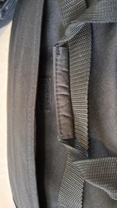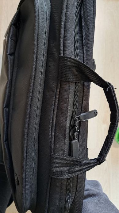 Ima 3 predele - za prenosnik, podaljške oz. napajalnik ipd. Zadaj ima tudi priročen trak za uporabo na potovanjih - za postavitev na držalo kovčka.