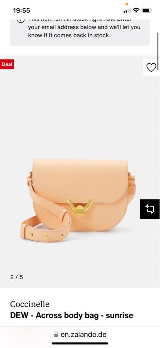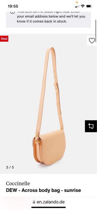 Prodam novo usnjeno torbico Coccinelle model Dew v barvi sunshine, nežno marelična barva, zelo mehko in kvalitetno usnje, trije predali, zapira se na gumbek. Mere 22x18x7. Darilo, a mi model ne ustreza. Zraven pride dust bag in po želji original Coccinelle papirnata nakupovalna vrečka. Torbica je nova in ni bila nikoli v uporabi.