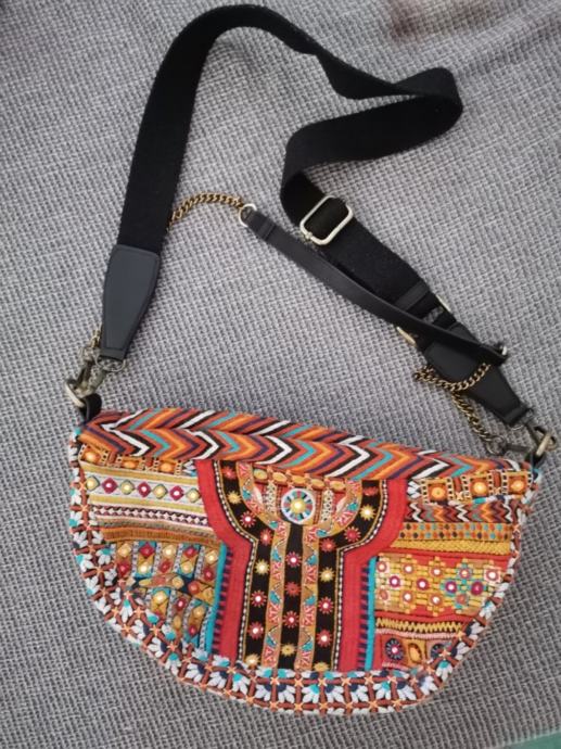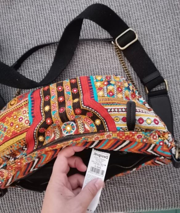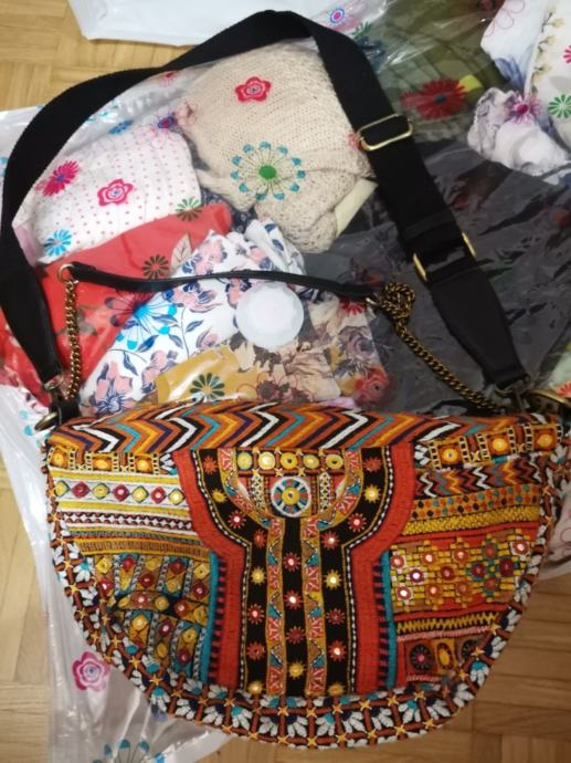 Zelo malo rabljena torbica Desigual atraktivnega poletnega videza. Enkratna za k oblekicam. Dva pasova, eden za čez ramo in drugi kovinski za v roke. Dovolj prostorna za denarnico, telefon, robčke in še kaj. Zadrga spredaj za shranit ključe in notranji predal z zadrgo. Torej tri enote shranjevanja (zunaj spredaj, zgoraj čez torbico in notranji predal). Res malo uporabljena. Skoraj kot nova.