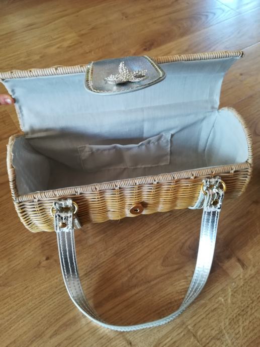NOVA ženska torbica, v obliki valja, naravno pletena, svetlo bež barve s srebrnimi detajli - ročke srebrne, mere 29 cm, fi 13 cm.