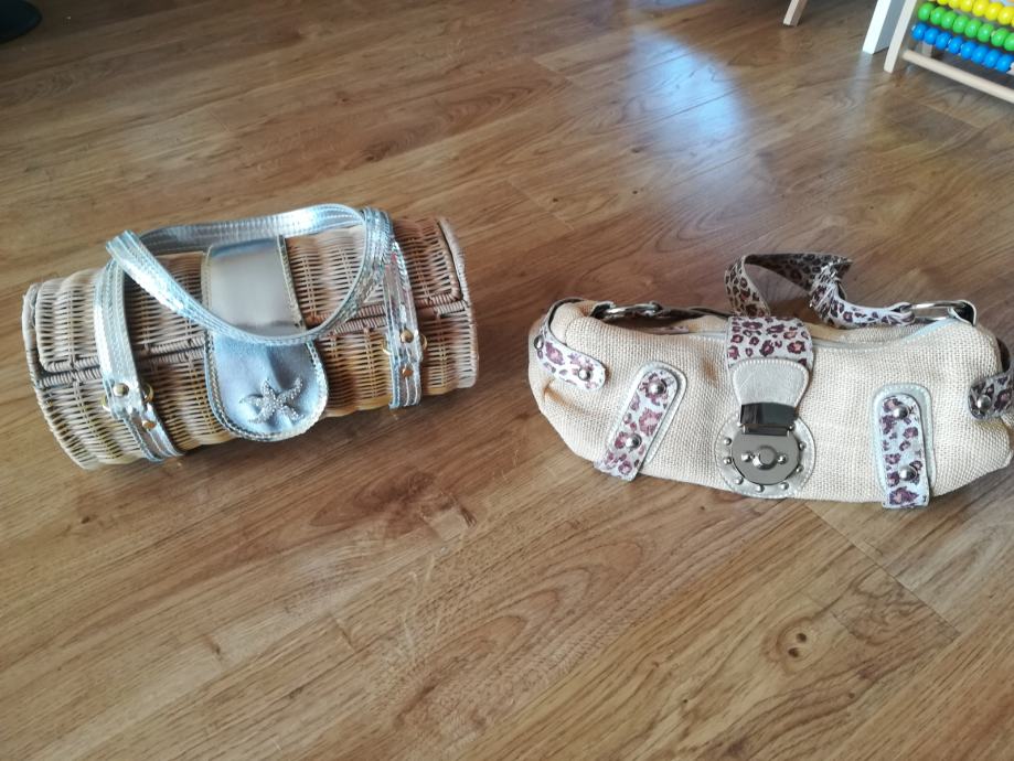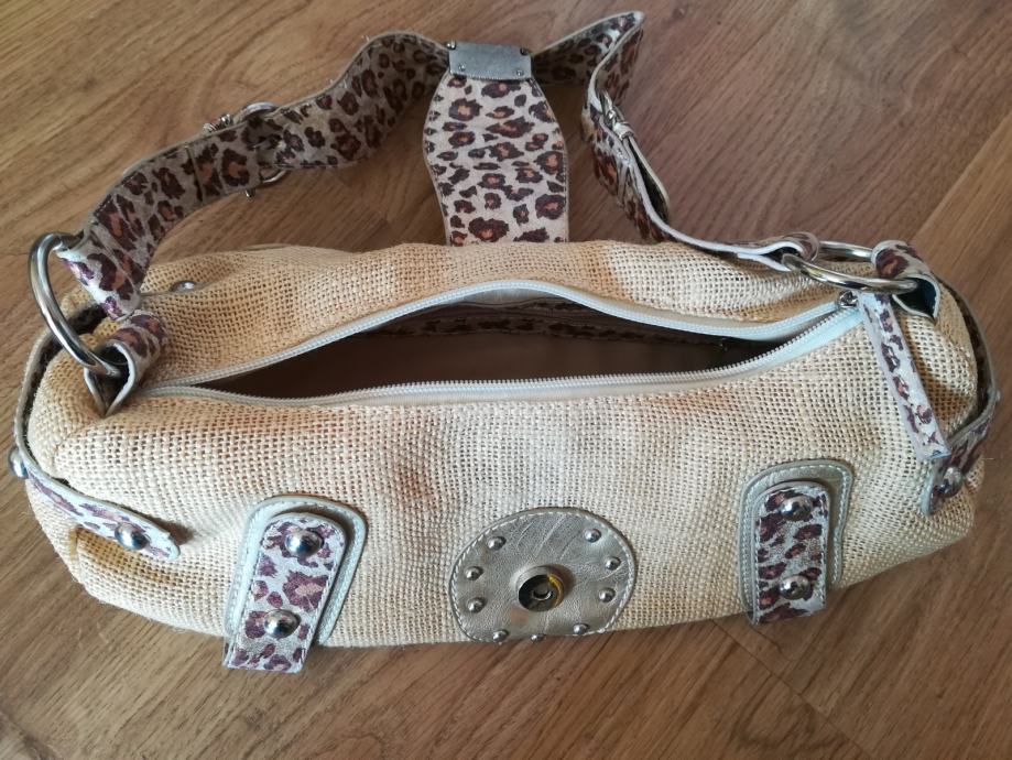 Tudi druga je NOVA torbica, ta je bež barve, narejena iz žakljevine + leopardji detajli, mere 35 x 13 cm.