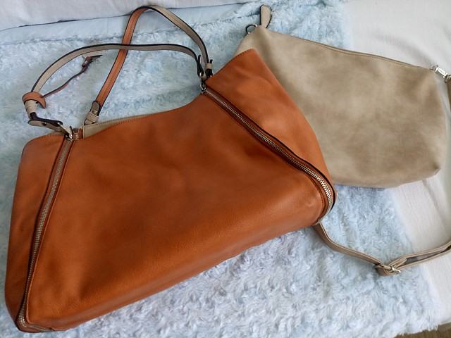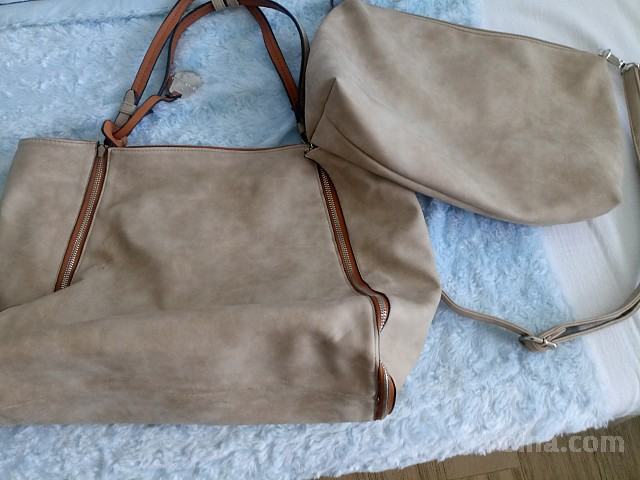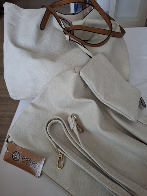 rjave ali bež barve. Torbica se z zadrgami obrne na drugo stran. Zraven je še ena torbica, ki se jo lahko nosi kot posebej ali kot vložek v večji.