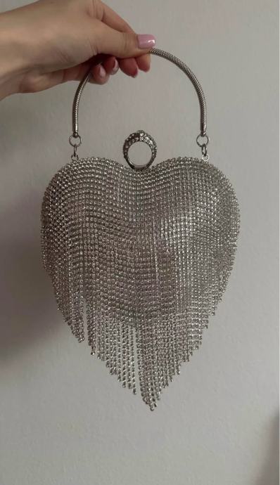 Prodajam elegantno torbico v obliki srca, ki je popolnoma nova in še neuporabljena. Torbica ima čudovit dizajn s srebrnim kovinskim okvirjem in ročajem. Sprednja stran je bogato okrašena z bleščečimi kristalčki, ki ustvarjajo razkošen videz z dekorativnimi resicami na spodnjem delu. Zapira se z okroglim zapiralom, prav tako okrašenim s kristalčki. Ta modna torbica je idealna za posebne priložnosti, kot so poroke, zabave ali romantični večeri. Zaradi svoje unikatne oblike in bleščečega videza bo zagotovo pritegnila pozornost in dopolnila vsako elegantno opravo.