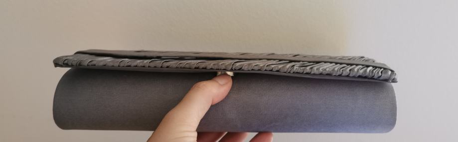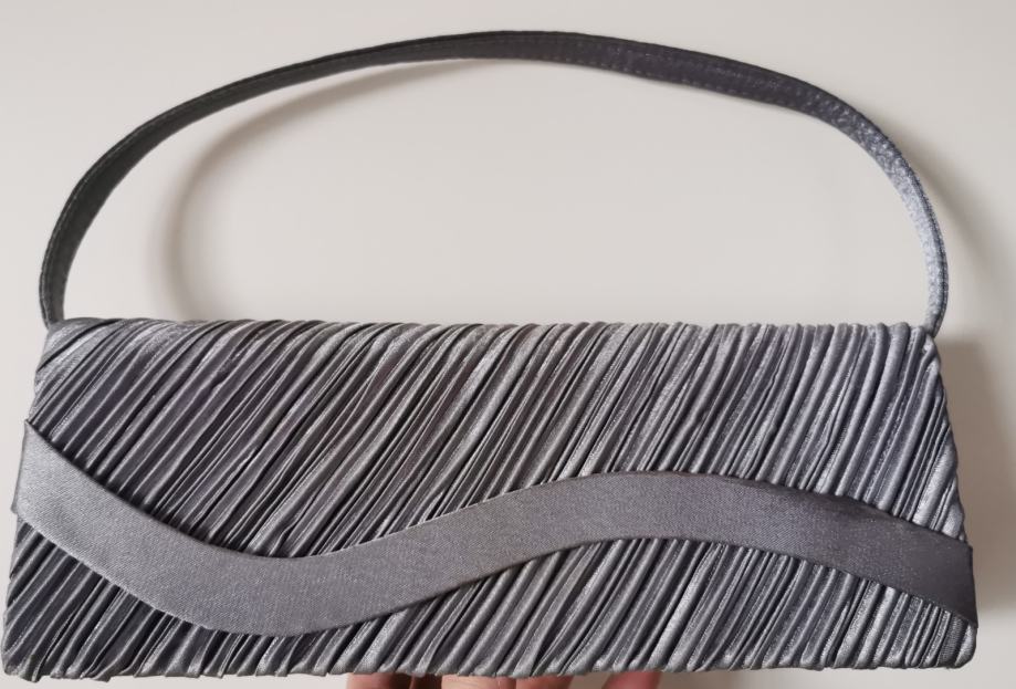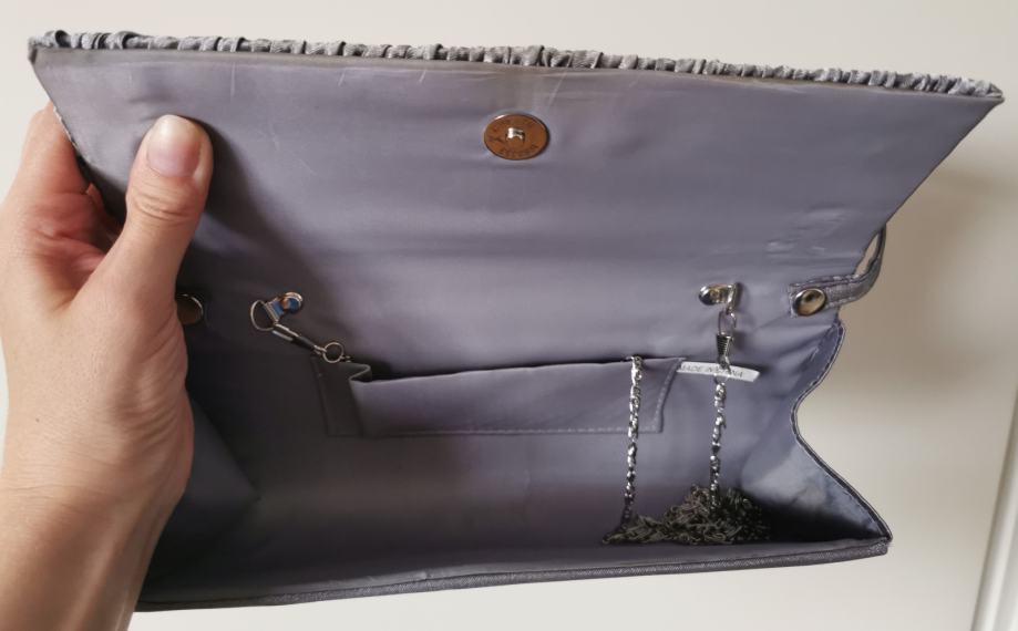 Prodam elegantno večerno torbico srebrne barve, zraven sta srebrn pašček in dolga srebrna veriga. Dolžina 25,7 cm, širina 10 cm, globina 5 cm.