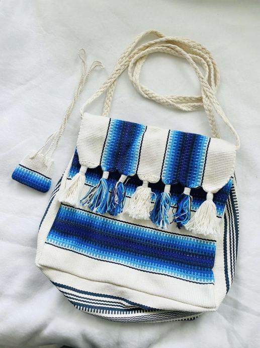 Ročno izdelana srednje velika torba, izjemno kvalitetna. Kupila sem jo v Urugvaju. Žal je nisem nikoli nosila. Bela z modro-vijoličnimi črtami. Idealna za poletje! Zraven dodam še mini mošnjiček za malenkosti.