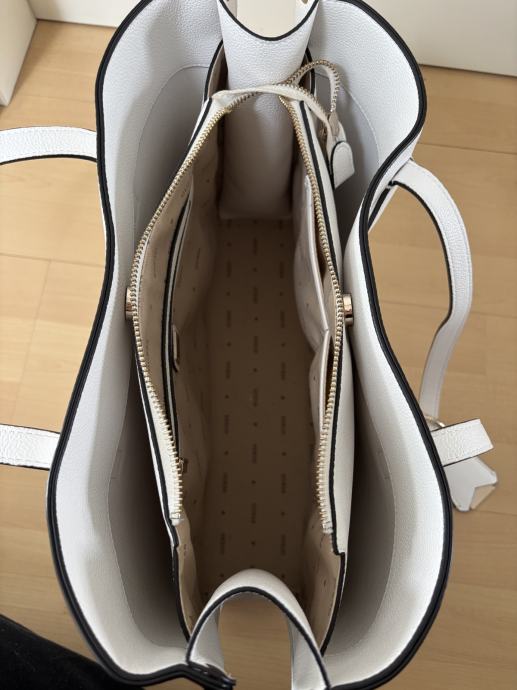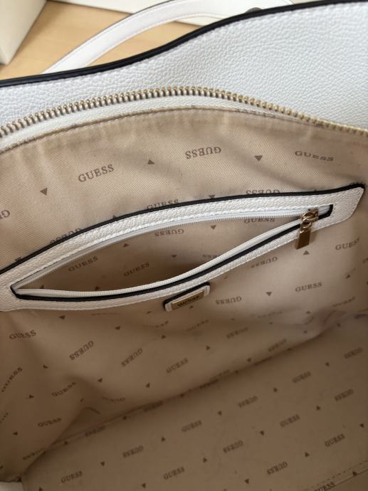 Skoraj nova bela original Guess torbica. Je zelo prostorna ima tri velike žepe, na sredini je en žep na zadrgo in dva brez nje. vse zadrge in gumbi so nepoškodovani. Prodam zaradi nakupa nove.
