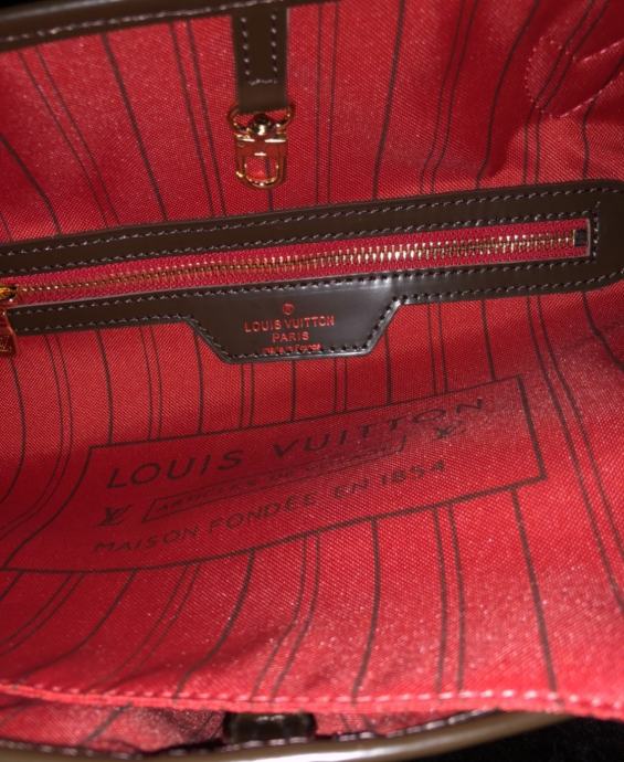 Louis Vuitton Neverfull Damier torbica iz pravega 100% usnja z rdečo notranjostjo. Kvaliteta torbice je 1:1 torej vrhunska in najboljša kar jo je možno dobiti od tega modela torbice. Na torbici so vse tudi najmanjše podrobnosti. Torbica ima tudi serijsko številko. Cena torbice je 250€. V kompletu je: