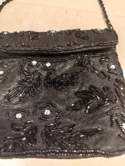 Nova mala črna torbica. orbica je okrašena z perlicami in ročaj je tudi iz črnih perlic. Znotraj je poleg glavnega prostora še en mali predalček, zapira se na magnet. Velikost 16 x 16 cm, dno 13 x 6 cm, dolžina ročaja 136 cm.