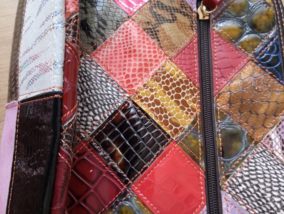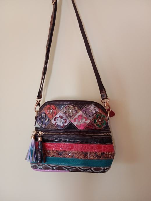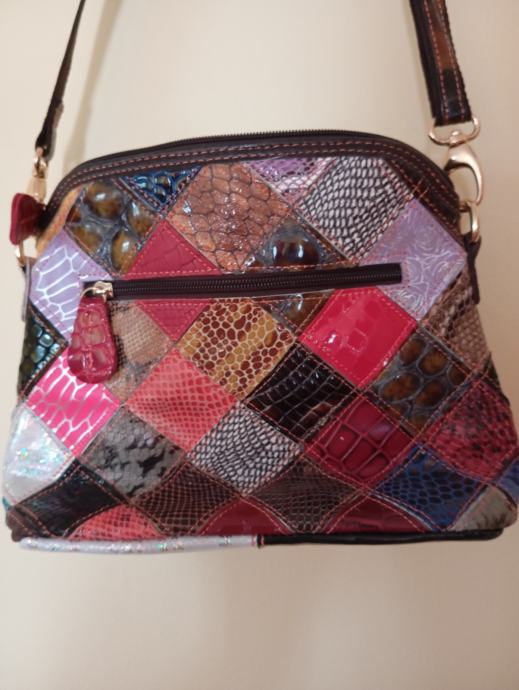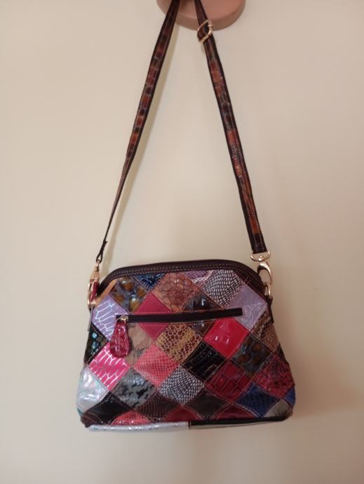 Nova, pisana, v notranjosti ima en predal z zadrgo in dva brez. Velikost je 25 x 23cm, dolžina roča je cca 50cm x 2, roč je nastavljiv, ne menjam, ptt ni vključena v ceno