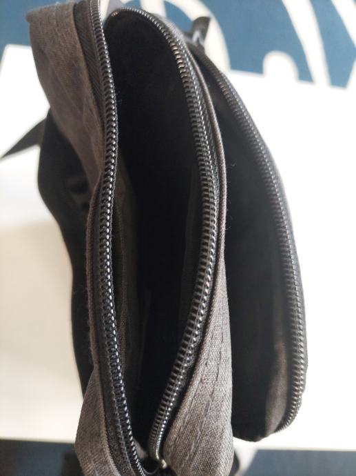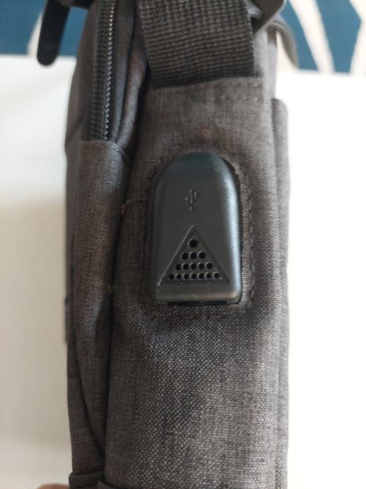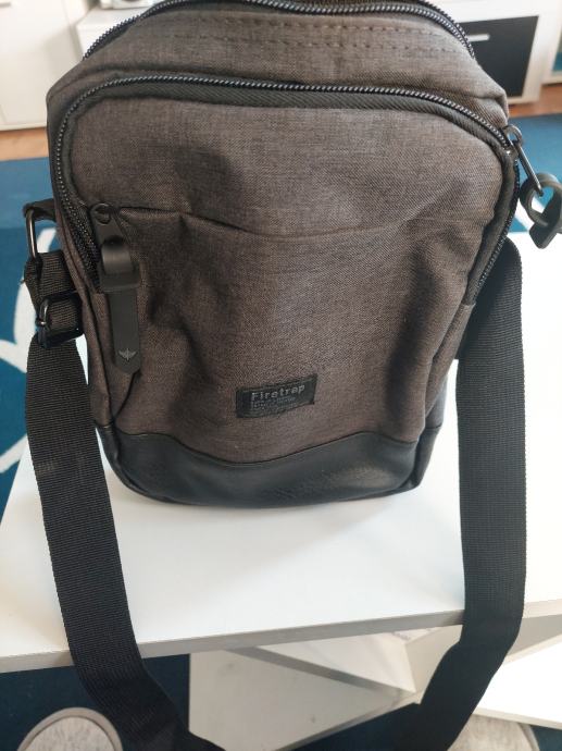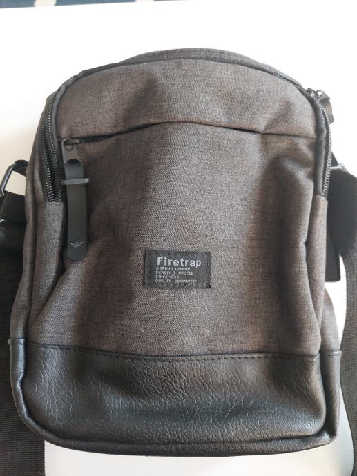 Prekoramna torbica Firetrap sivo melange barve, spodaj umetno usnje. Na strani izhod za polnilni kabel