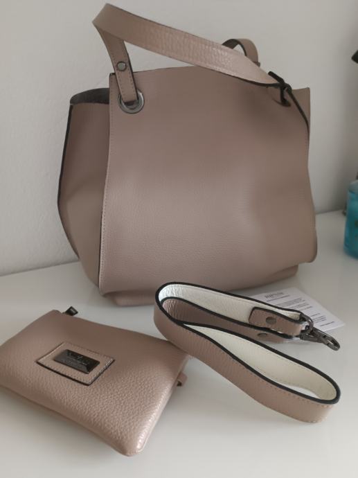 Usnjena Ripani torbica z dodano "denarnico" in pasom, peščene barve, notranjost srebrne barve, Dust-Bag-om.