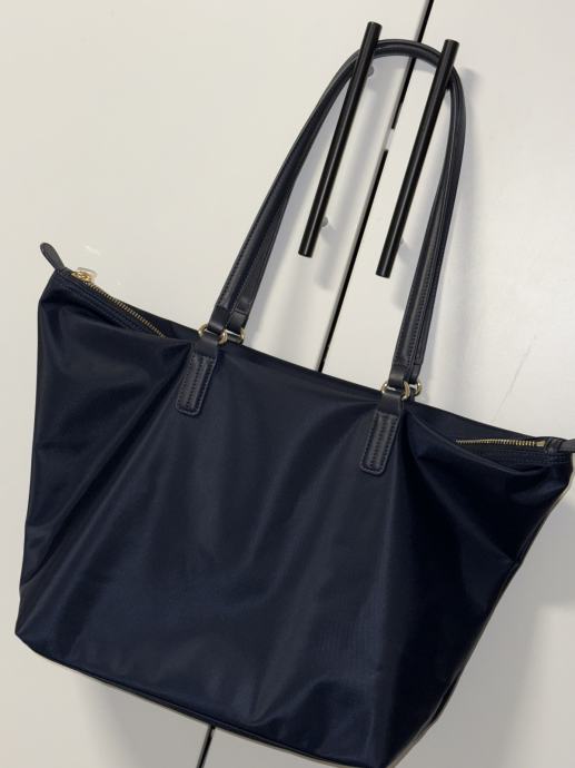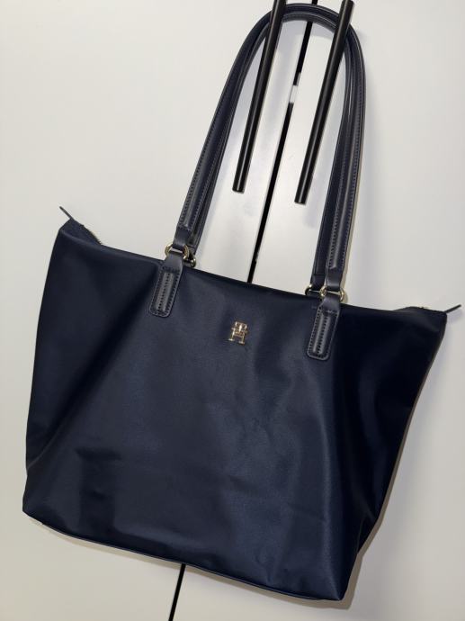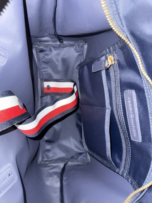Prodam orginal Tommy Hilfiger nakupovalno torbo “Poppy” oz. Tote bag “poppy” v temno modri barvi z zlatimi detajli. Kupljena na About you za 89,90€ , prodam za 59,90€. Višina 33cm, dolžina 32cm , globina 13 cm, višina ročajev 24cm.