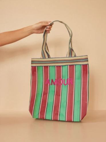 Nakupovalna torba 40 cm x 40 cm z večbarvnimi črtami in napisom “AMOUR” na sredini - izdelana iz reciklirane plastike. Odlična je za manjše opravke, za na plažo in nakupovanje živil. Z lahkoto jo zložite in vzamete s seboj v torbici. Lahko pa jo preprosto obesite čez ramo in jo povsod nosite s seboj.