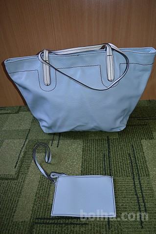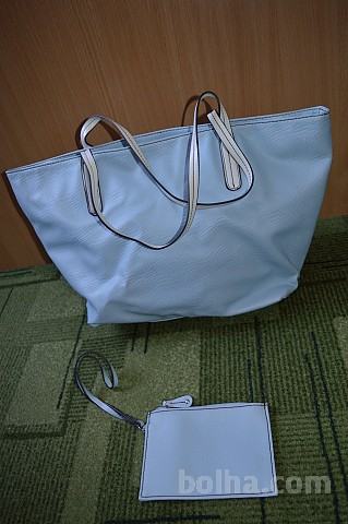 Modra torbica z belim ročajem + mala torbica. Približno 18x14 cm spodnji del. Zapne se na zadrgo in ima dva žepa (en ima zadrgo). Mala torbica na paščku z zadrgo (15x11 cm).