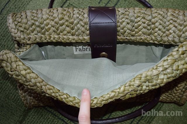 Pletena olivno zelena fabrizio. Približno 40x25x10 cm. Znotraj je podložena z blagom in znotraj sta dva žepka (en je z zadrgo). http://www.fabrizio.de/