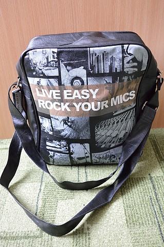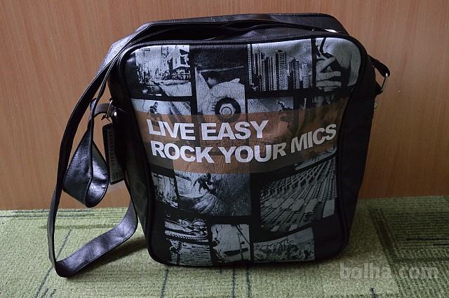 Črna torba z potiskom. Približno 29x33x12 cm. Zapne se na zadrgo in znotraj ima še dva žepka (ena se zapne na zadrgo).