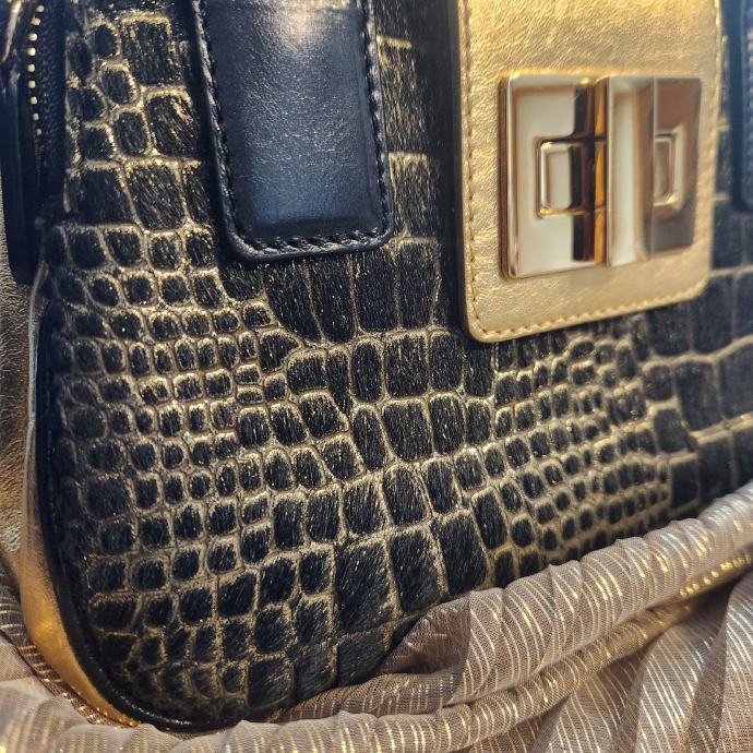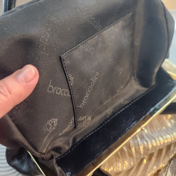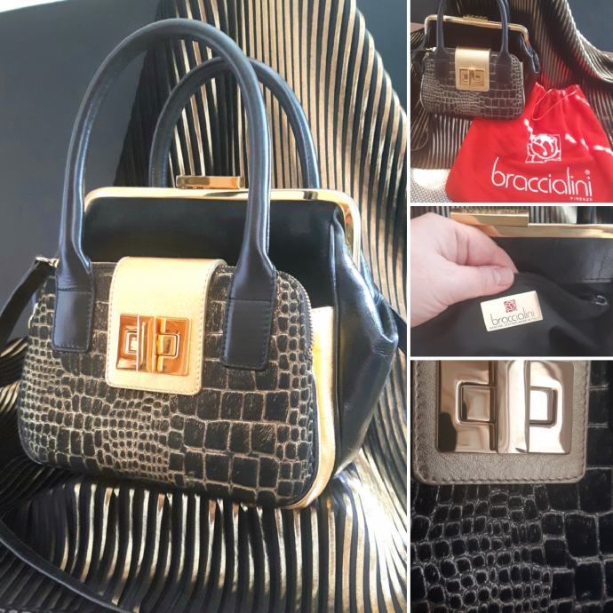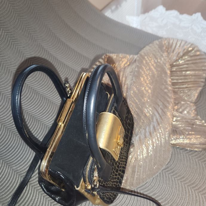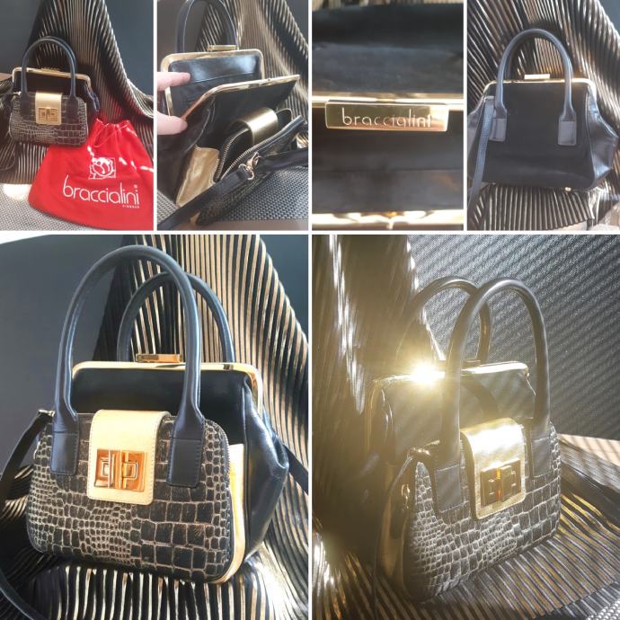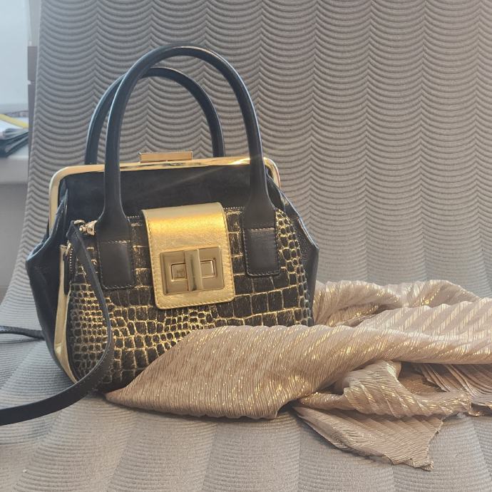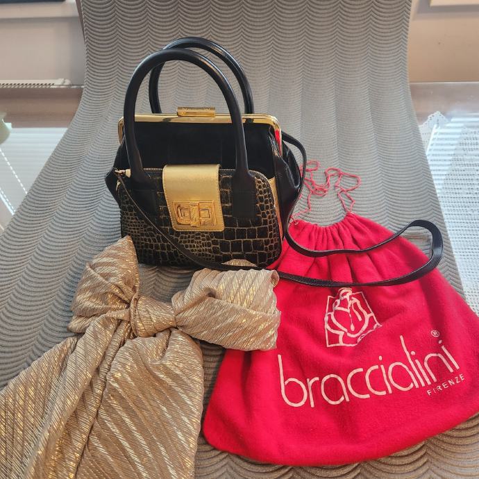 Prodam set: ženska elegantna torbica+šal, brend torbice Braccialini, originalna, tudi pasček za čez ramo, material kombinirano: pravo usnje, semiš, krzno z zlatim potiskom. Kot nova. Črno/zlata barva. Šal je zlate barve. (Italija). Prevzem Slovenska Bistrica, ali tudi pošiljam po pošti z odkupnino po prevzemu. Stroški pp moji.