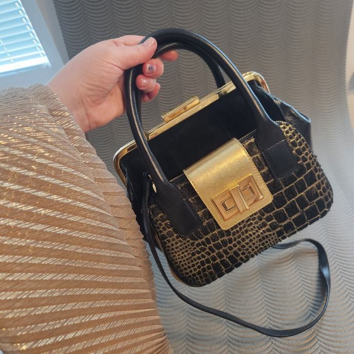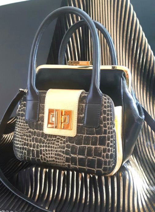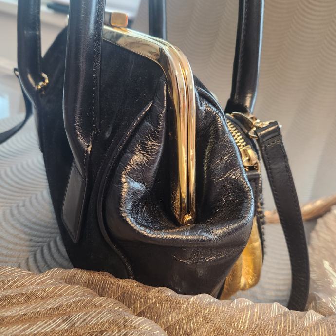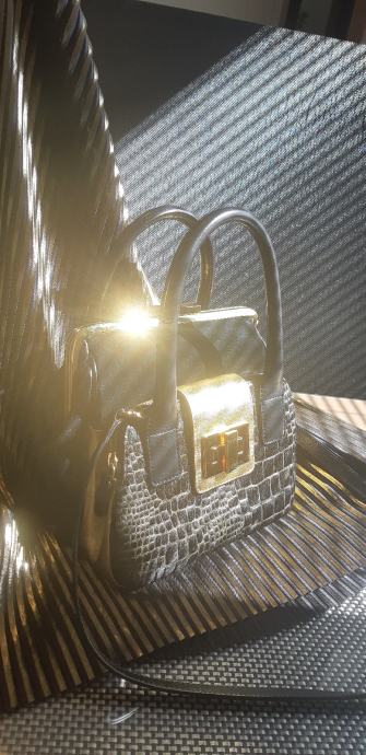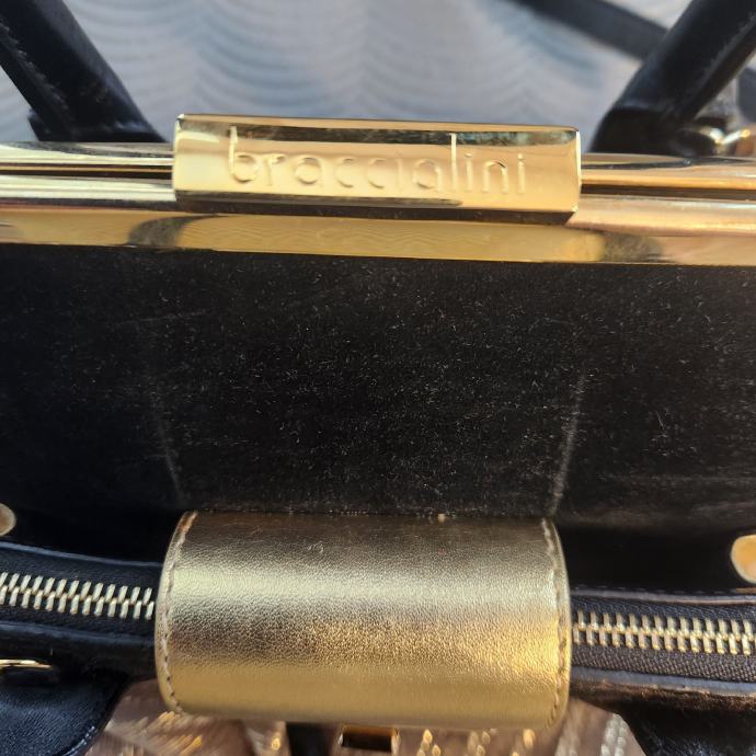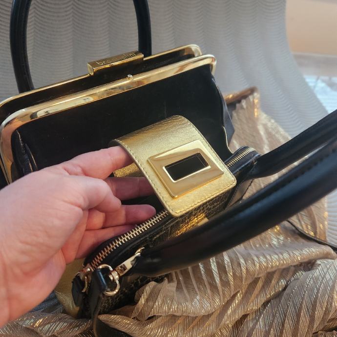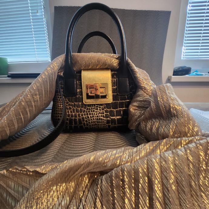 Prodam set: ženska elegantna torbica+šal, brend torbice Braccialini, originalna, tudi pasček za čez ramo, material kombinirano: pravo usnje, semiš, krzno z zlatim potiskom. Kot nova. Črno/zlata barva. Šal je zlate barve. (Italija). Prevzem Slovenska Bistrica, ali tudi pošiljam po pošti z odkupnino po prevzemu. Stroški pp moji.
