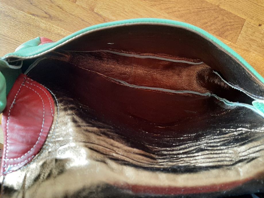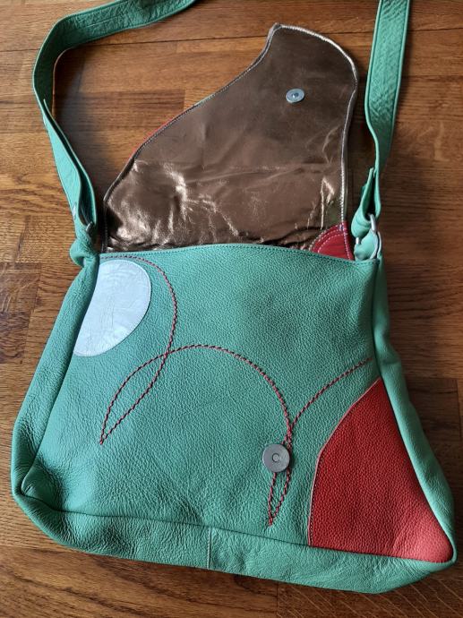 Nova, nikoli nošena, torbica širine 30 cm, višine 25 cm cca, iz pravega usnja, znotraj usnje v bakreni barvi. Naramnica / pas za čez ramo premakljive dolžine.