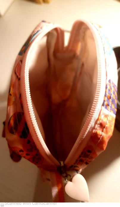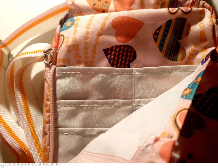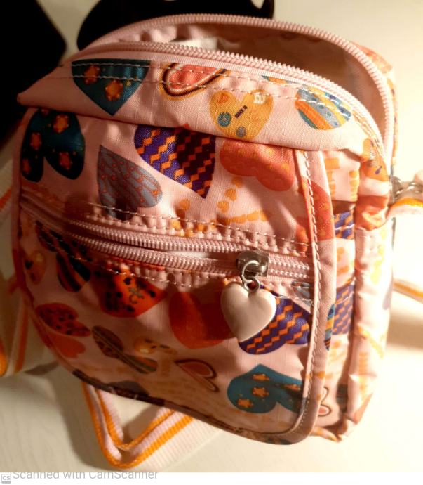 Glavni del ima 1 notranji žep in se zapre z zadrgo. Spredaj ima atraktiven poklopec, na katerem je žep na zadrgo. Ko odpreš poklopec, ki se zapenja z ježkom je znotraj še en predel s stransko zadrgo, na njem in v njem pa kar nekaj predelnih žepkov. Vse zadrge imajo obesek - roza srček.