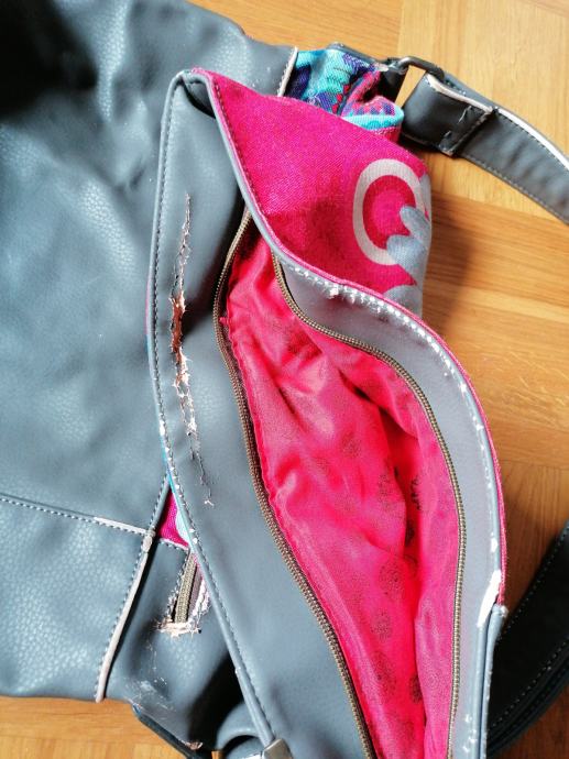 Prodam torbico Desigual z vodnimi znaki uporabe - na naranmem pasu na robovih, znotraj na vrhu, zadaj pri zadrgi