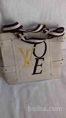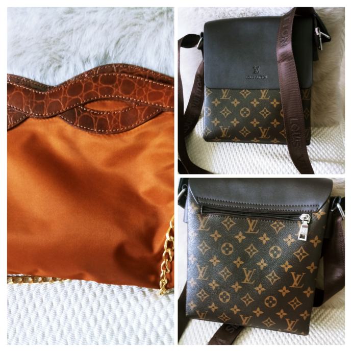 Love LV bež barve, trdo platno - bombaž, velikosti 33x39x8 cm, malo rabljena 16 eur, torbica Mazzini vel. 25x20 cm nova 16 eur in torbica LV vel. 22x25 cm, nova 65 eur, uprabna kot ženska ali moška torbica, torbica LV z dodatno notranjo torbico nova 75 eur, torbica in denarnica Michael Kors, nove 80 eur ter torba LV, velikost 35x32, 25 eur, obesek za ključe LV 16 eur.