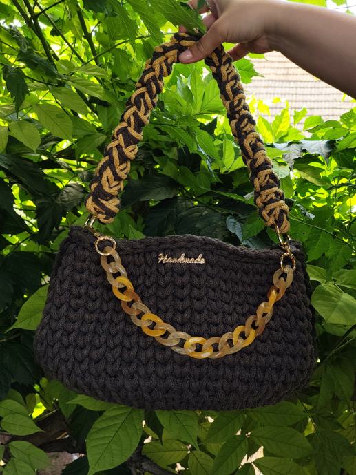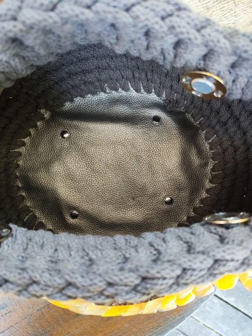 Ročno kvačkana torbica z usnjenim dnom in magnetnim zapiralom.