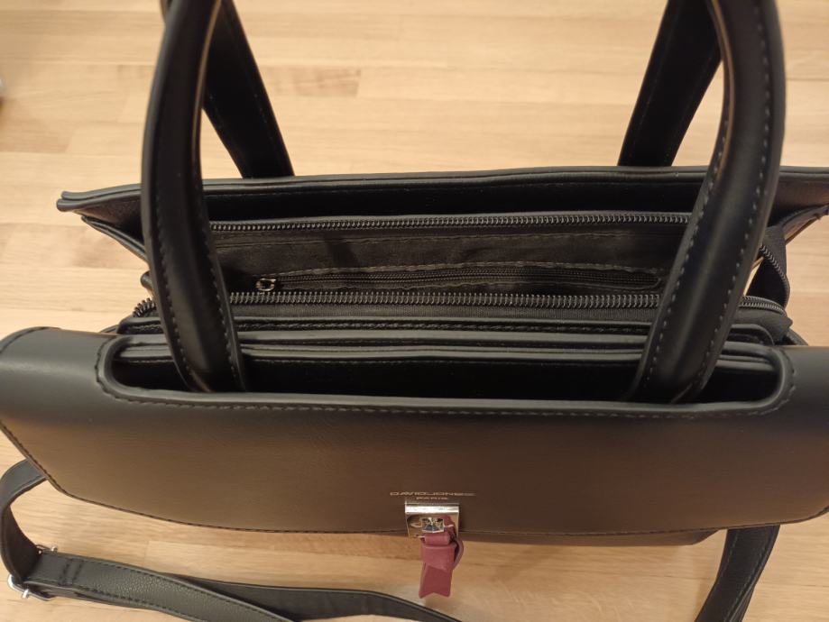 Črna torbica iz umetnega usnja, z dvema razdelkoma in veliko predali. Torbica ni bila uporabljena, ker ne pride na vrsto in mi zaseda prostor v omari. Dimenzije: 29x23x10 cm. Pas za nošenje preko rame je snemljiv.