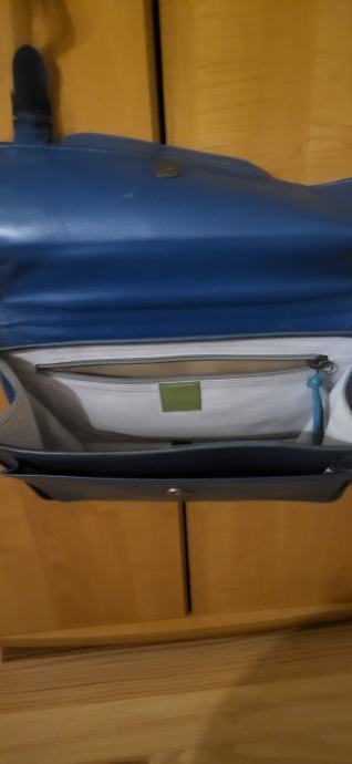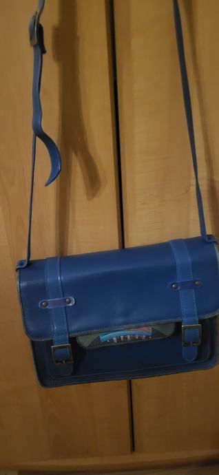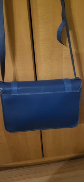 Usnjena modra torbica ,katera se zapira na net, notri en glavni predal in dva manjša. Mere 28x20 cm. Inf.na 031 300 099