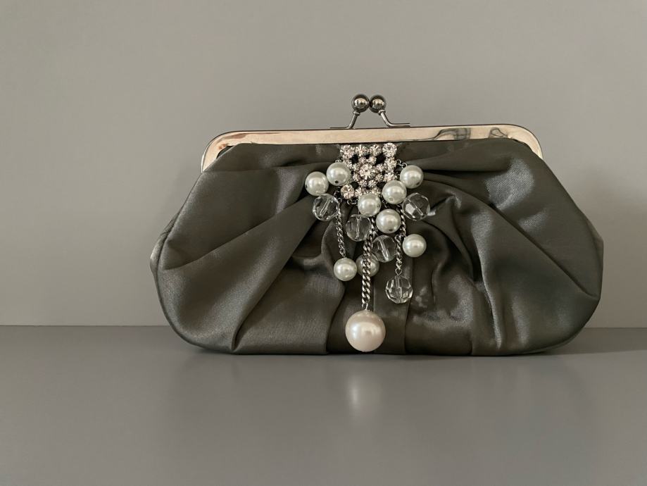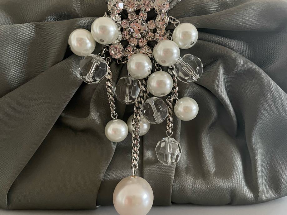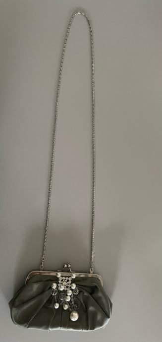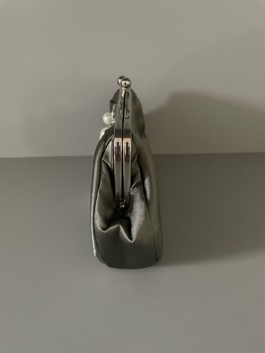 Večerna torbica v srebrno-sivi barvi, okrašena s kristalčki in "biseri"