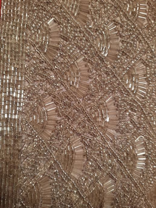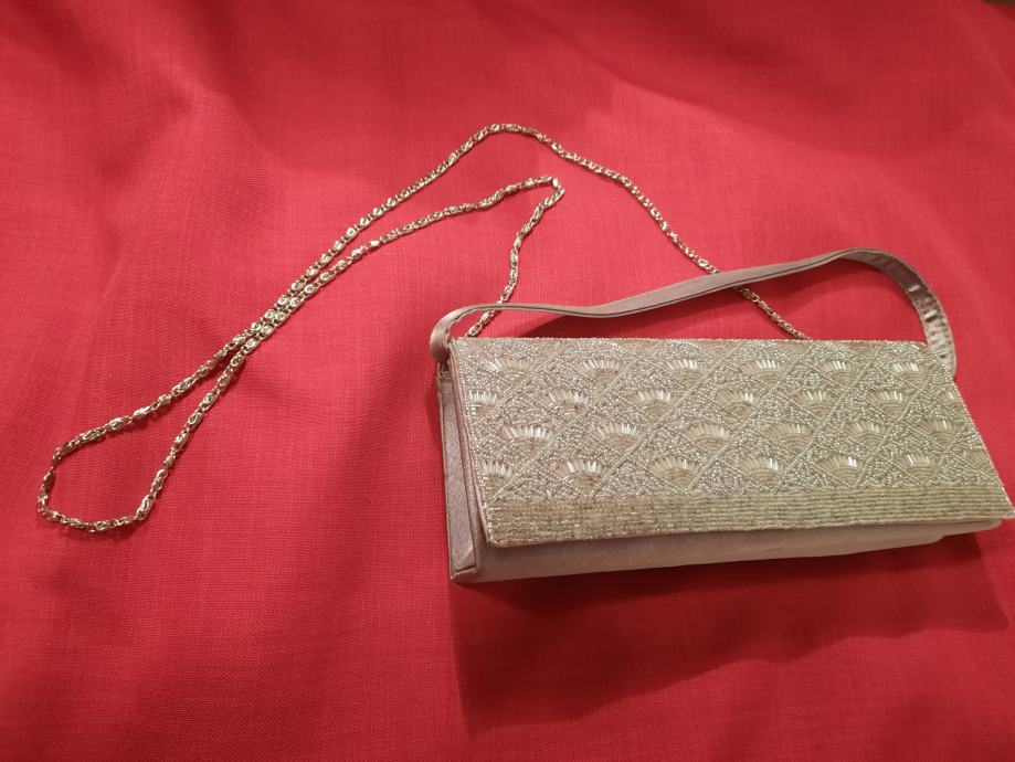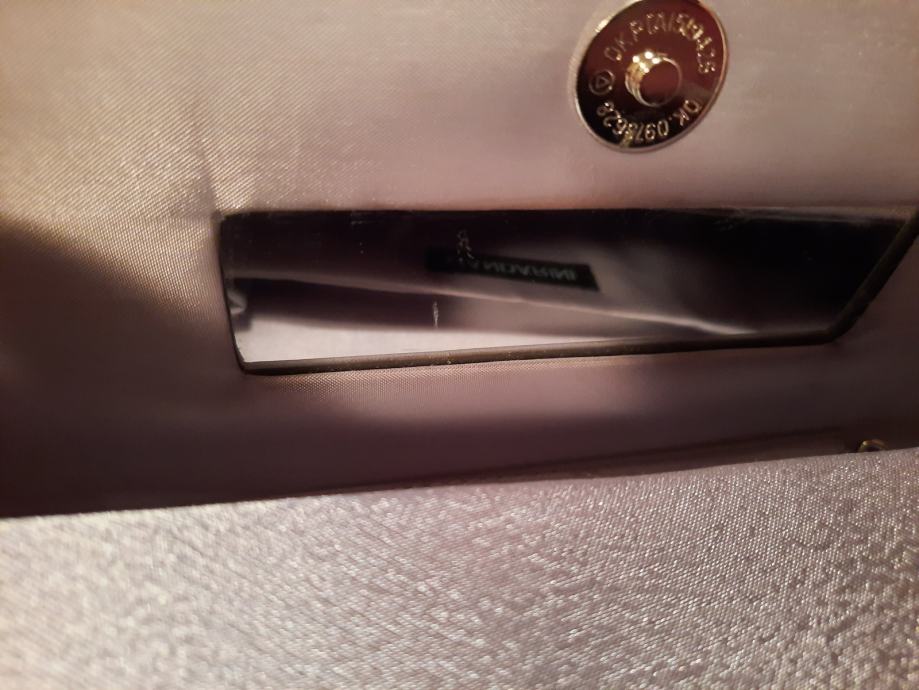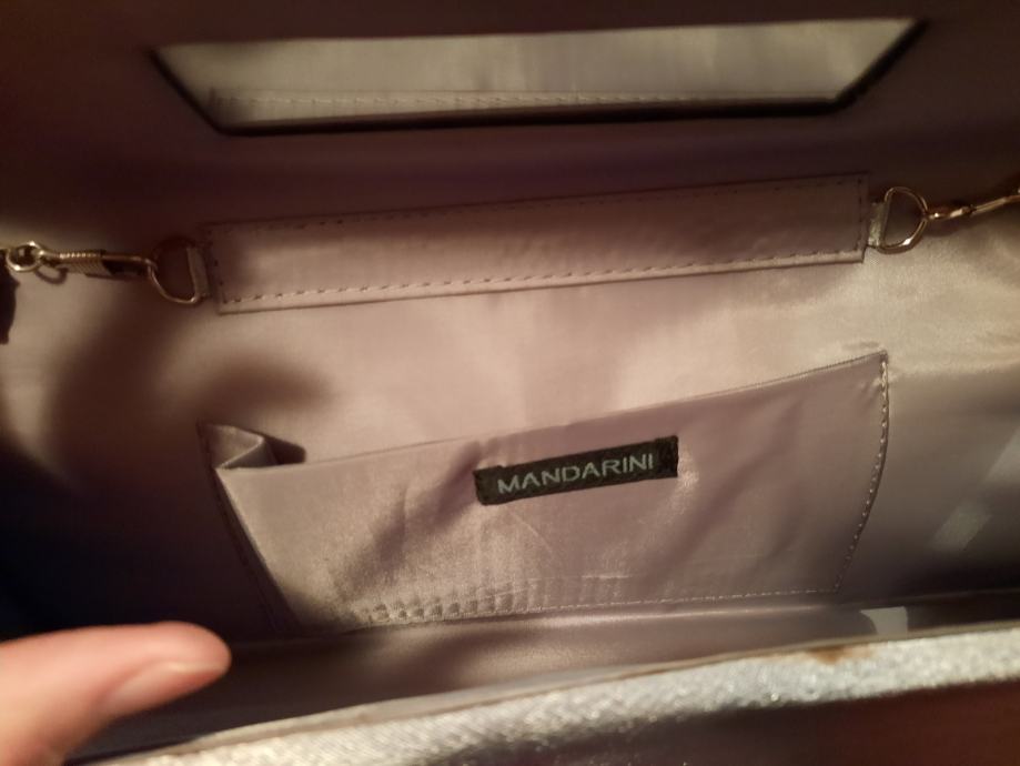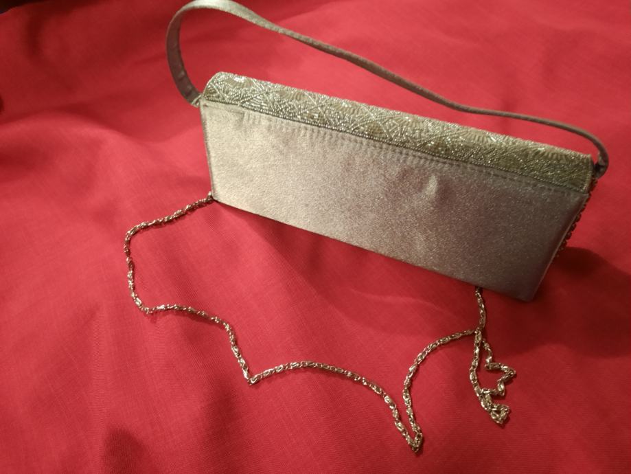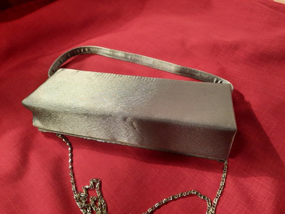 Ugodno prodam večerno elegantno torbico, za posebne priložnosti. Iz blaga in s koraldami na sprednji strani, v srebrni barvi. Z dvema ročajema, daljši je kovinski, dolg 115 cm. Mere š 26, v 11, g 5 cm. Ima res čisto majhen madež na notranji strani v dolžini 5 mm in širini 1 mm (komaj viden na zadnji sliki). V notranjosti ima še en žepek in ogledalce. Nikoli nošena. Italijanske znamke Mandarini.