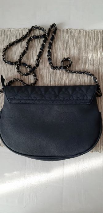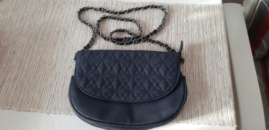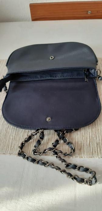 Ženska temno modra torbica, manjša, nova, zelo lepa, nikoli uporabljena, z dolgim ročajem ( za čez ramo ). V notranjosti je temno modra podlaga, ob strani ( v notranjosti ) je manjši žep, ki se zapira z zadrgo. Zaradi varnosti je po celi širini torbice zadrga. Material torbice je umetni material, širina torbice je 25 cm, višina pa 19 cm.