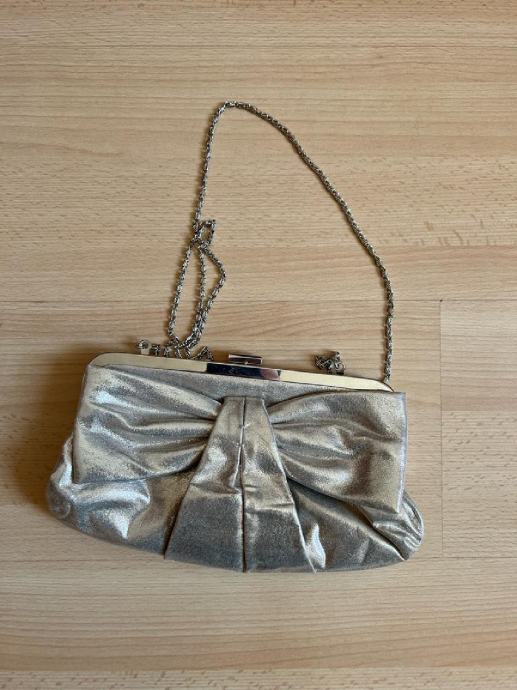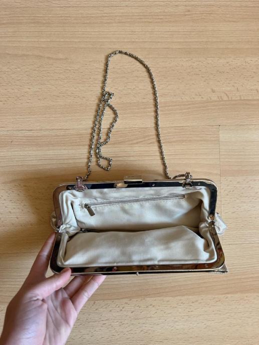 Malo rabljena zlata zenska torbica s kovinskim trakom za cez ramo.